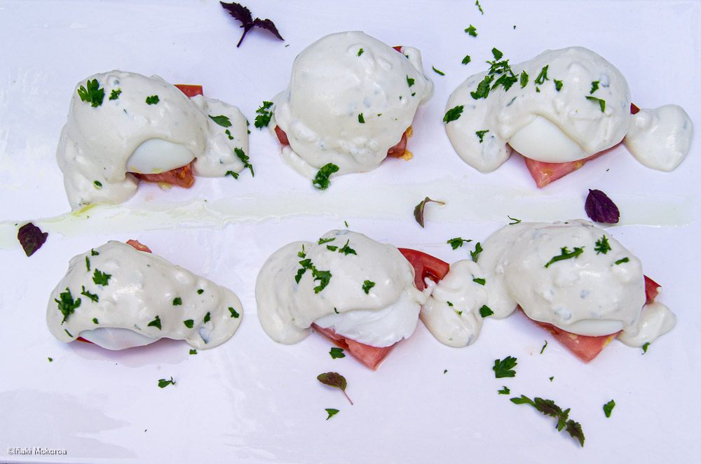 Colocar las rodajas de tomate y encima de cada una poner medio huevo con la yema hacia abajo y cubrirlos con la crema de queso con vinagreta.