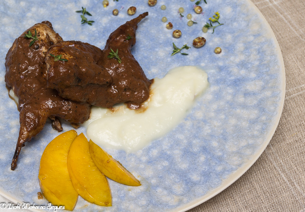 Servir las codornices cortadas por la mitad, con la salsa y acompañadas de los melocotones y esferas de mostaza.