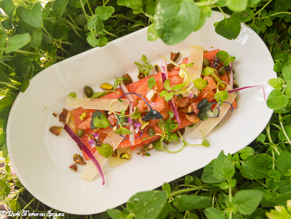 Cuadrar la sandía y cortar láminas finas. Reservar.